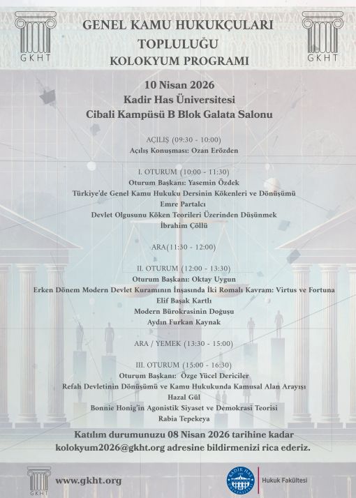 Genel Kamu Hukukçuları Topluluğu (GKHT), 7. etkinliği olan Kolokyum, 10 Nisan 2026 Cuma günü Kadir Has Üniversitesi Cibali Kampüsünde, B Blok'ta yer alan Galata Salonu'nda gerçekleştirilecektir. Katılım durumunuzu 08 Nisan 2026 tarihine kadar kolokyum2026@gkht.org adresine bildirmenizi rica ederiz.
